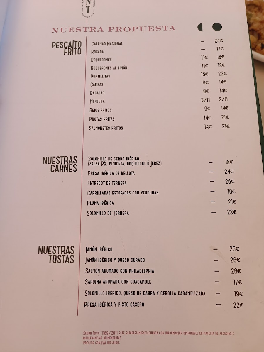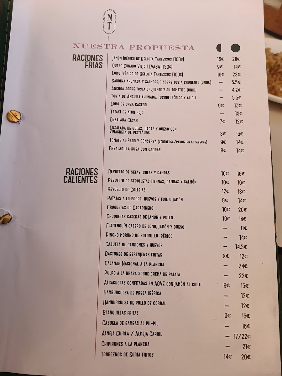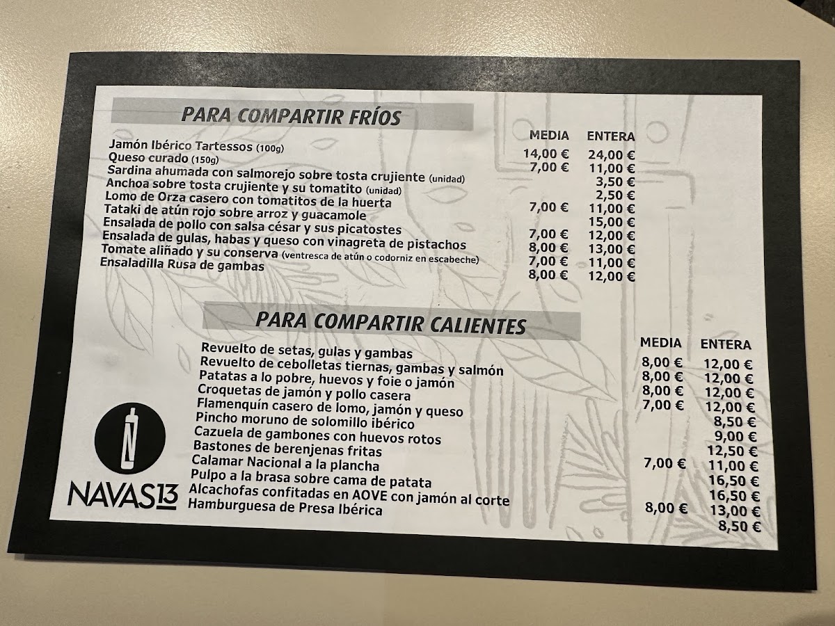 The menu at Navas 13 offers a variety of traditional Spanish tapas and light meals alongside a selection of coffees and other beverages. Visitors can expect a range of small plates featuring local specialties such as tataki de atún, ensaladilla rusa, and pincho moruno de solomillo. Larger dishes, including solomillo a la pimienta and paella, are also available for those seeking a more substantial meal.