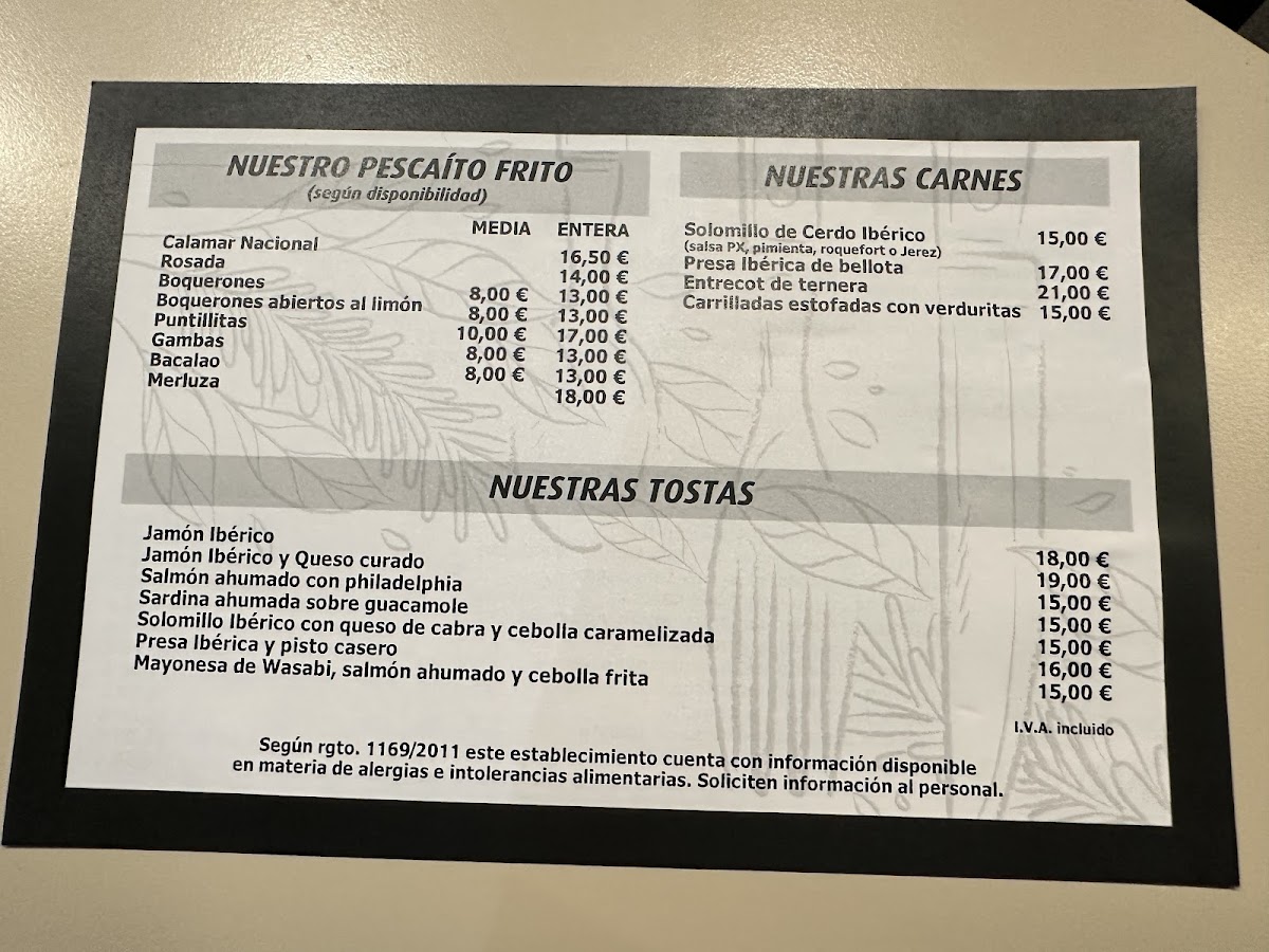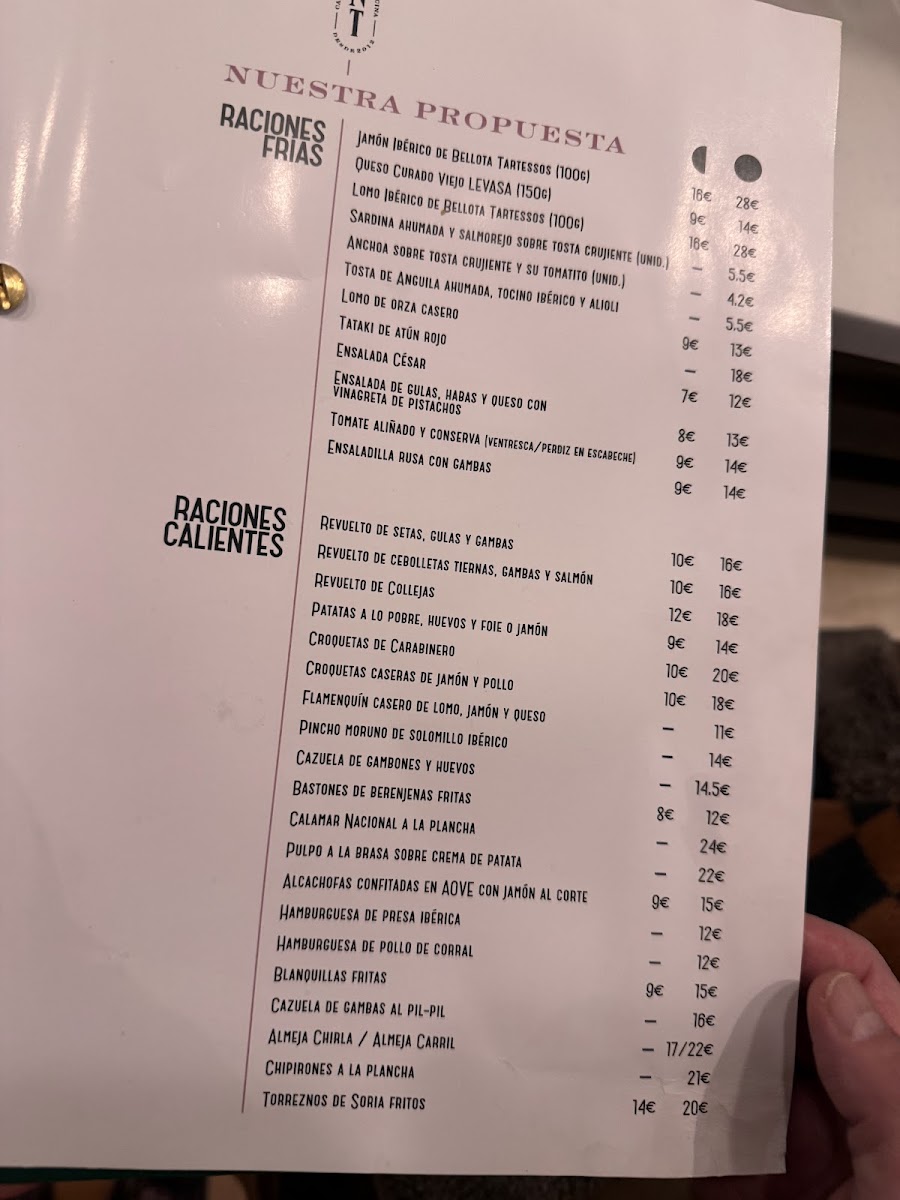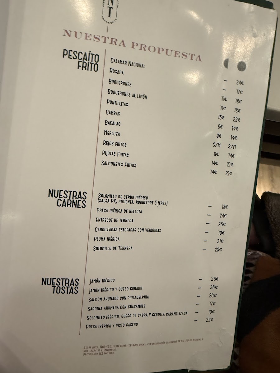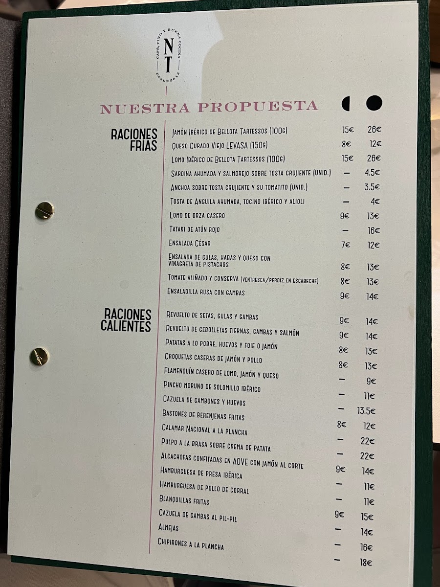 The menu at Navas 13 offers a variety of traditional Spanish tapas and light meals alongside a selection of coffees and other beverages. Visitors can expect a range of small plates featuring local specialties such as tataki de atún, ensaladilla rusa, and pincho moruno de solomillo. Larger dishes, including solomillo a la pimienta and paella, are also available for those seeking a more substantial meal.